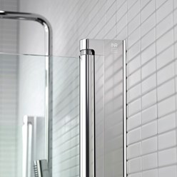Duschhörna 800x800 med två böjda, invikningsbara dörrar i det 6 mm tjocka glaset Clear, handtag och med profil i finished Polished.