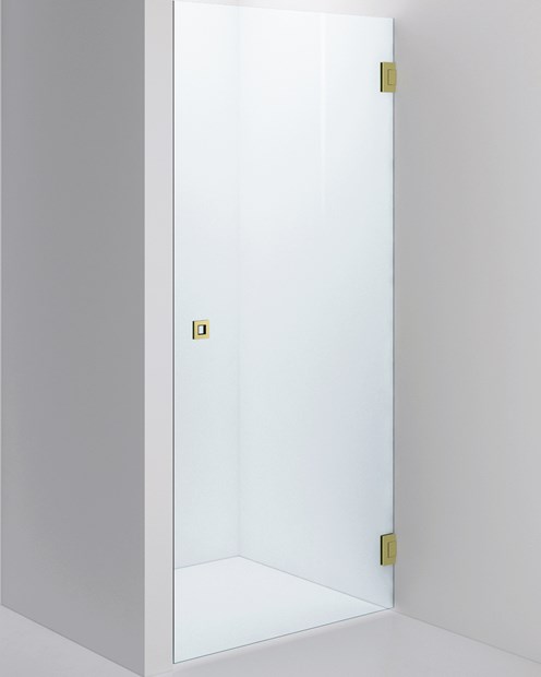 Duschdörr 900x2000 i det 8 mm tjocka glaset Clear och beslag i Polished Brass, för den mindre nischen.