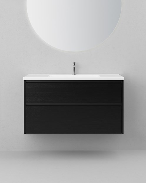 Kommod i färgen Black Oak med två lådor, grepplist och tvättställ i porslin.