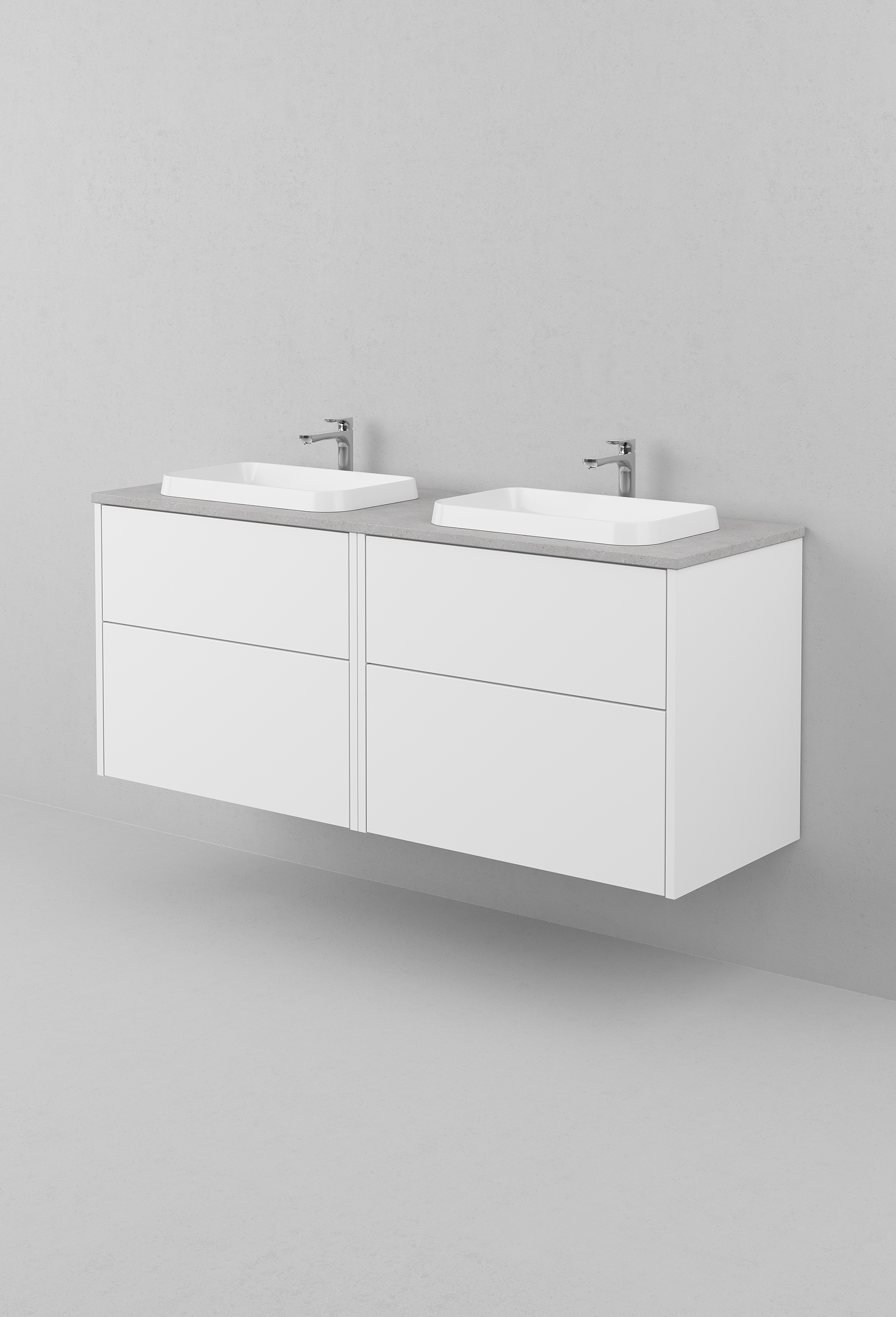 Kommod i färgen Premium White med fyra lådor, bänkskiva i Raw Concrete och dubbla tvättställ Level i vitt porslin.