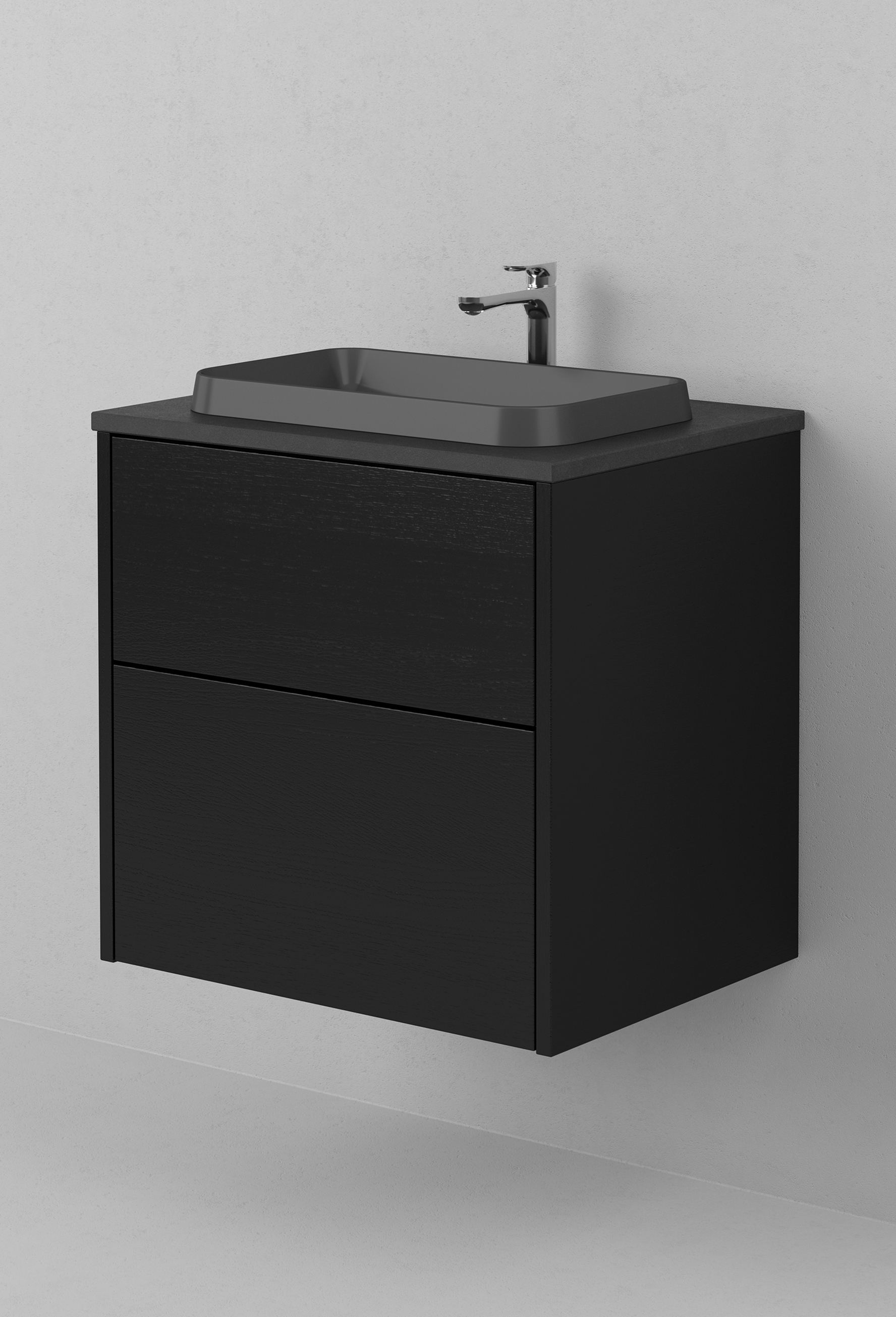 Kommod Grand Solid 60 cm i svart ek – komplett med bänkskiva och tvättställ i porslin utan blandare