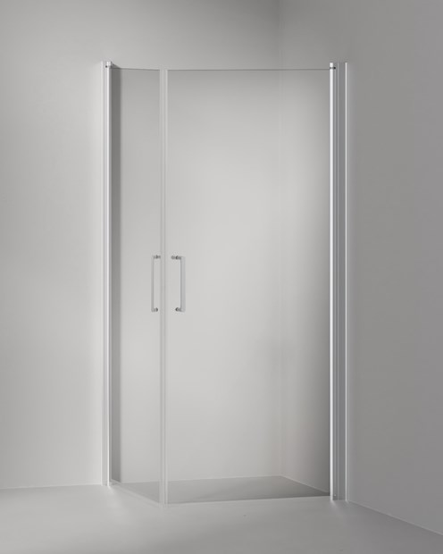 Duschhörna 1000x1000 med två raka, invikningsbara dörrar i det 6 mm tjocka glaset Clear, handtag och med profil i finished Polished.