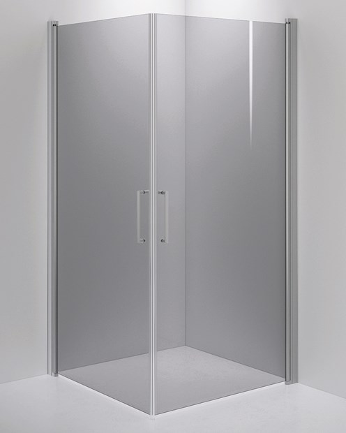 Duschhörna 1000x1000 med två raka, invikningsbara dörrar i det 6 mm tjocka glaset Smoke, handtag och med profil i finishen Matte Brushed.