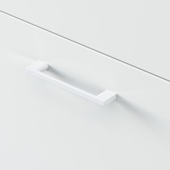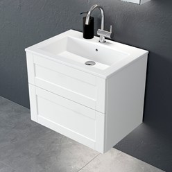 Kommod i färgen Premium White med två lådor, handtag Add i Matte White och tvättställ i stenkomposit.