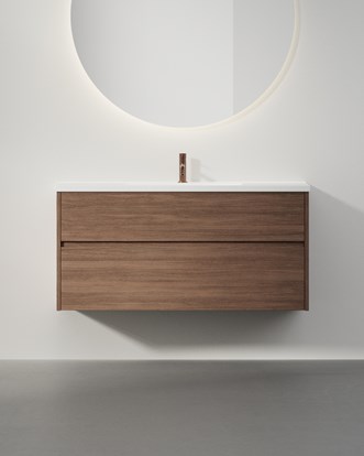 Grand Solid 100 i Dark Oak med bänkskiva Plain White och tvättställ Level i Matte White.