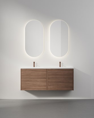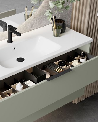 Den släta fronten till de innanförliggande lådorna skapar ett modernt och symmetriskt uttryck med raka linjer mellan lådor och gamlar. Grand Solid finns i flera vackra, äkta fanér, i vitt och i valfri NCS. Välj mellan heltäckande tvättställ i tåligt, blankt porslin och matt porslinstvättställ infällt i bänkskiva. Prova dig fram i vår studio och skapa din egen möbel med push-open eller valfritt grepp samt fina tillval på insidan. Alla kommoder