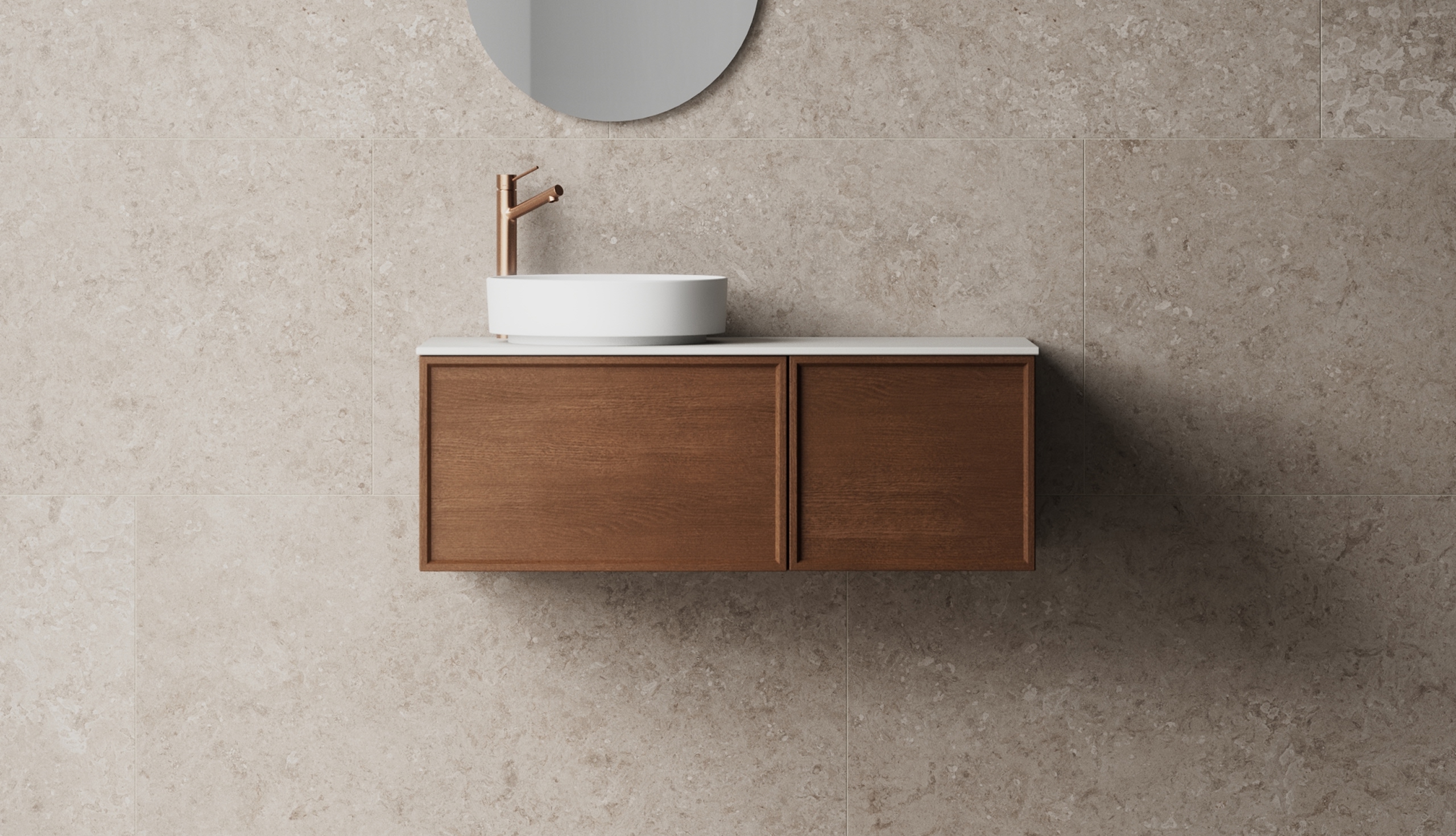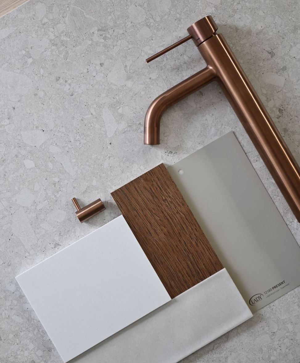 Brushed Bronze ger med sina varma koppartoner en vacker balans mellan klassisk elegans och modernitet. Finishen fungerar utmärkt med både varma och kalla material och kan enkelt anpassas till din personliga stil. För en industriell känsla, kombinera med polerad betong eller välj kakel i beige eller sandtoner för att framhäva värmen i finishen. Mörkt ekfanér på möblerna skapar en sammanhållen och inbjudande helhet. Scrolla ner för tips och inspiration.