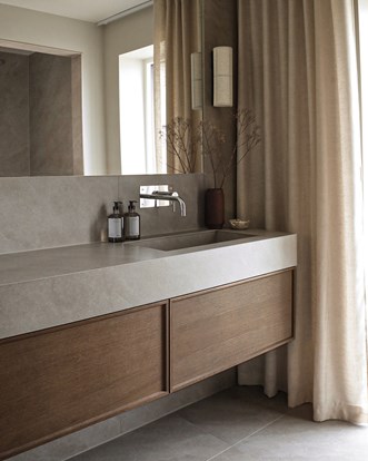 Att inreda ton i ton innebär att arbeta med olika nyanser av samma färg, i allt från väggar och golv till möbler och metaller på till exempel duschvägg och blandare. Detta ger rummet ett harmoniskt och mjukt uttryck där allt hänger ihop – en plats för stillhet och balans. Här kommer några badrum som kan inspirera dig som vill inreda ton i ton.