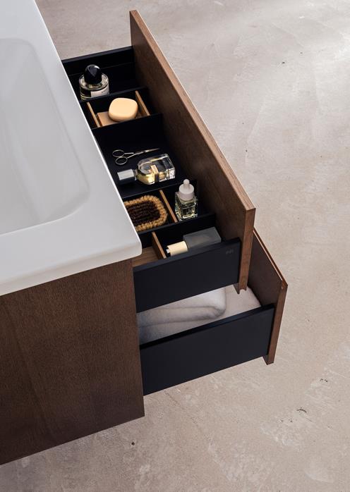 Det här badrummet är en hyllning till harmoniska, hållbara materialmöten och tidlös skandinavisk design. Här samsas vackra ytor och funktionella detaljer i en lugn och självklar helhet. I centrum står kommoden i brunbetsad ekfanér, vars djupa och naturliga ton ger rummet en varm och gedigen bas. Träets levande ådring skapar ett visuellt djup och en taktil närvaro – en yta som inbjuder till beröring och som ger badrummet sin personlighet. Som sval och slät kontrast mot träets värme vilar ett porslinstvättställ.