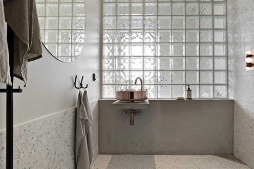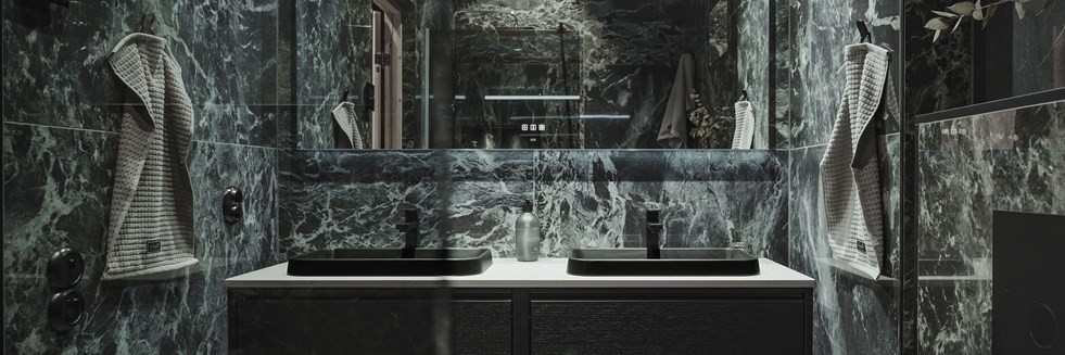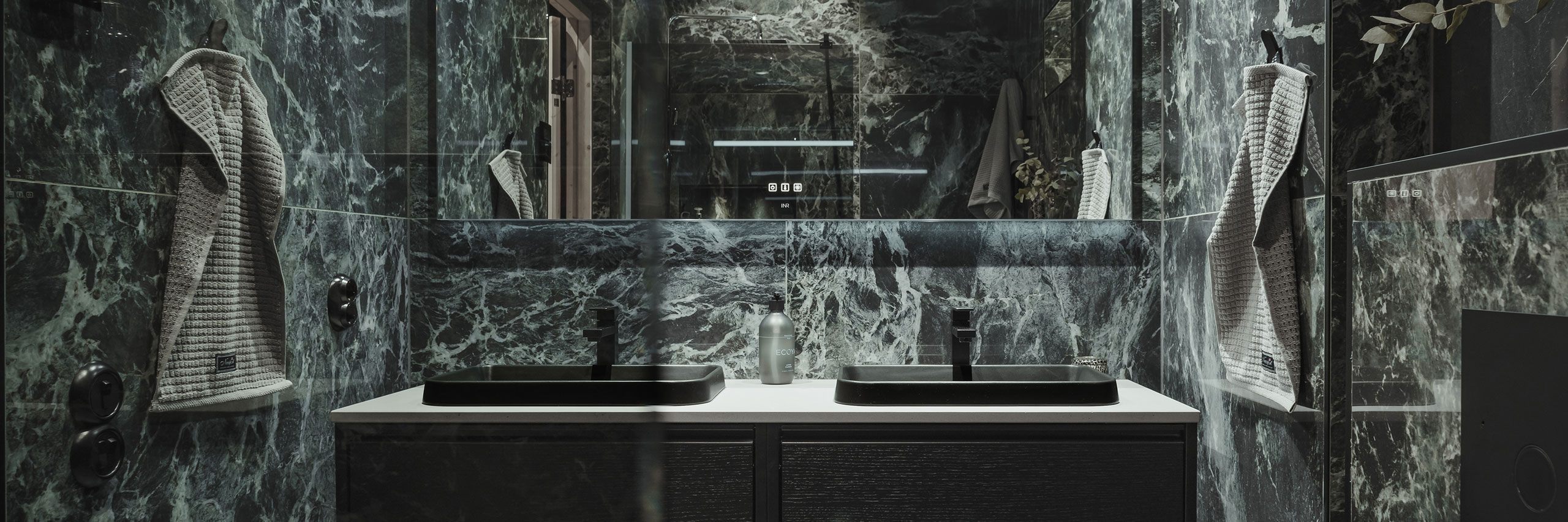 Som en röd tråd genom hela renoveringen fanns miljömedvetenheten. Med 70% återvunna material och fokus på material från trakten, har Sara och Robin gjort allt för att fånga den jämtländska andan. Ett av husets badrum är till exempel klätt helt i jämtländsk natursten. Det andra, som vi har fått besöka, fick en helt annan framtoning. Här valde paret att frångå det ursvenska och skapade istället ett extra allt-badrum i lyxig grön marmor. Ett badrum för snabb återhämtning med produkter som både håller och som sätter guldkant på vardagen för vilken skid- eller vardagshjälte som helst. Hör Saras vision och tankar bakom inredningsvalen i badrummet!