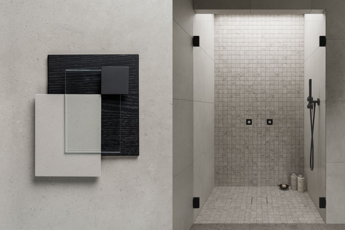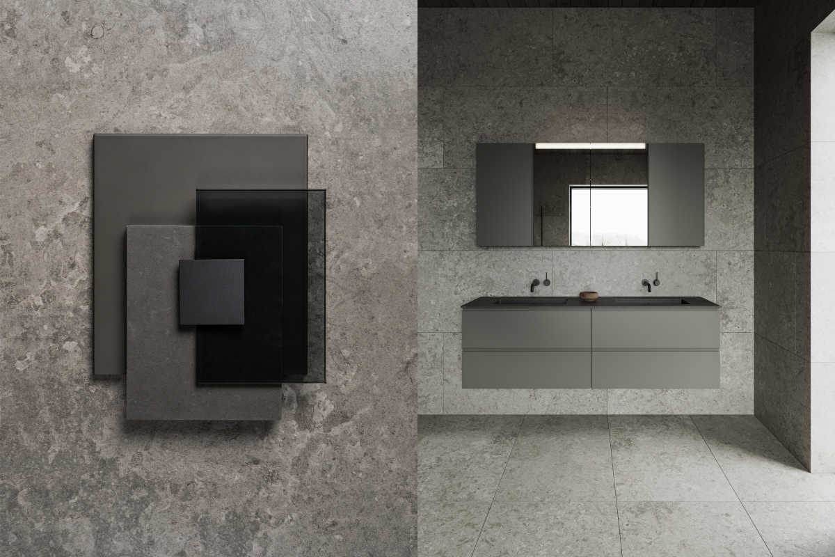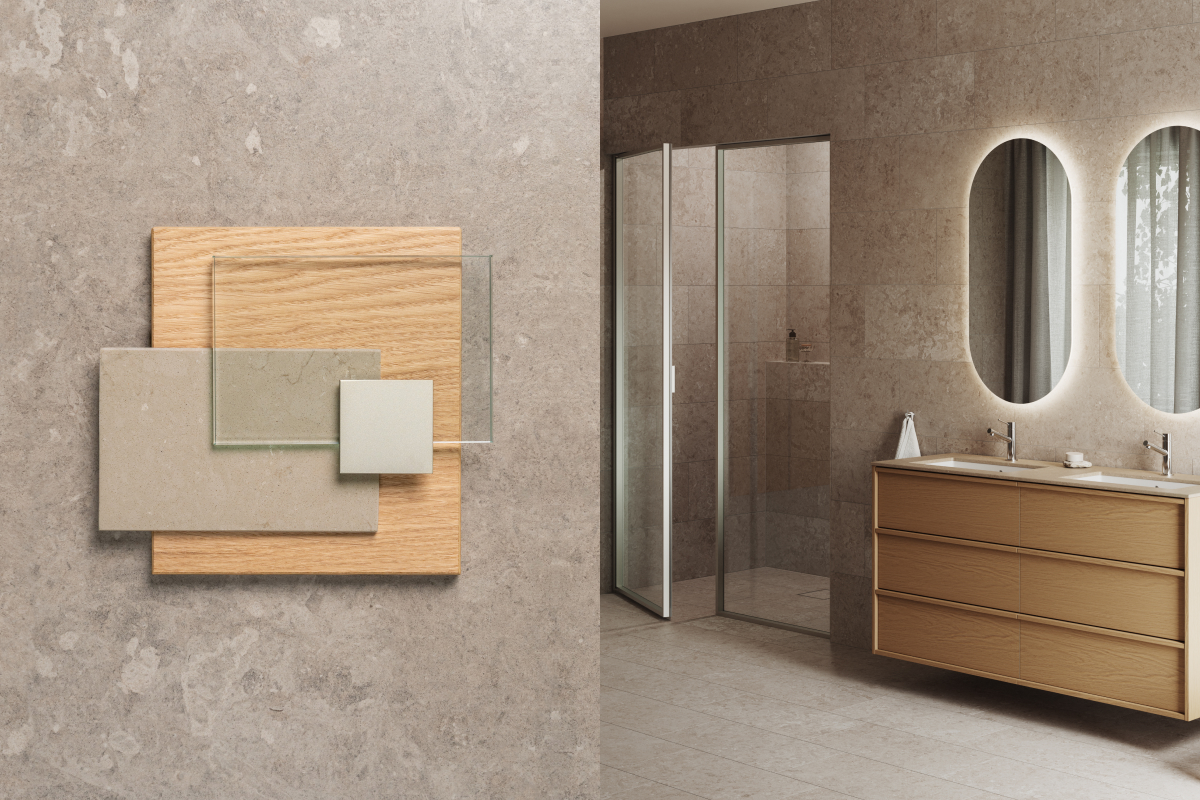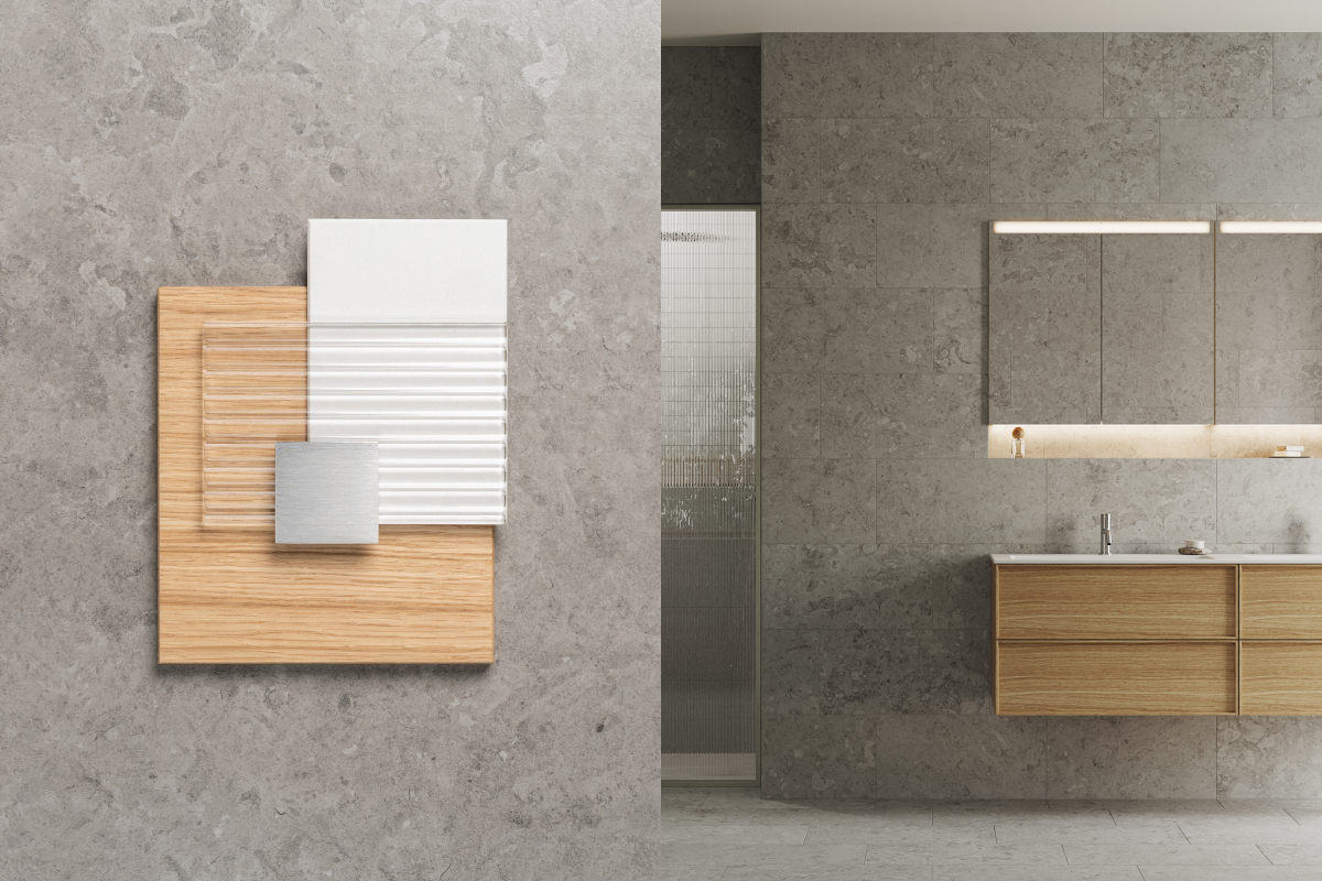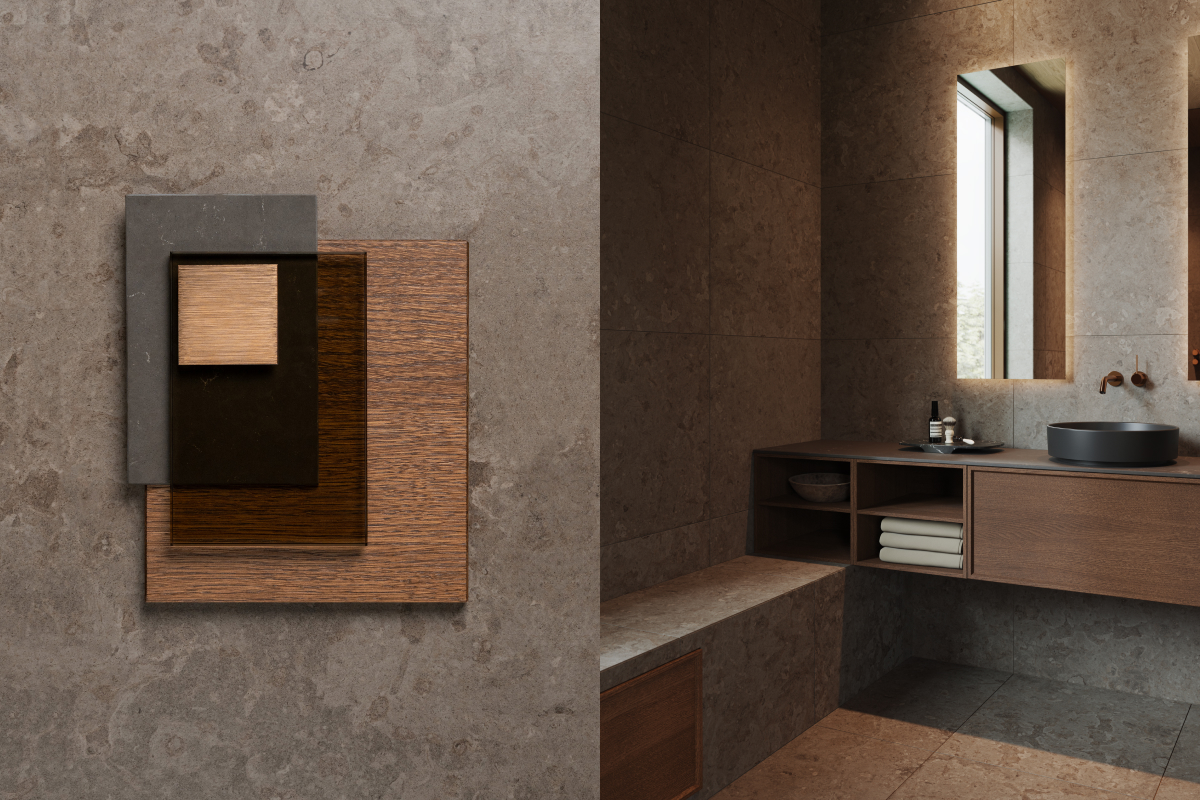 Hay bygger på kontrasten mellan ljust och mörkt – en palett där det skandinaviska uttrycket får tyngd och elegans. Granitkeramiken Stenvide Hay på väggarna paras med Stenvide Fog på golvet – ljusa tolkningar av gotländsk kalksten med stilla skiftningar som tillsammans skapar en lugn och luftig bas. Mot det ljusa träder inredningen fram i mörk ekfanér och varmt bronstonade metaller, som tillsammans tillför djup och karaktär. Hay är en palett för dig som vill skapa ett skandinaviskt badrum med varma träslag, balanserade kontraster och tidlös närvaro.