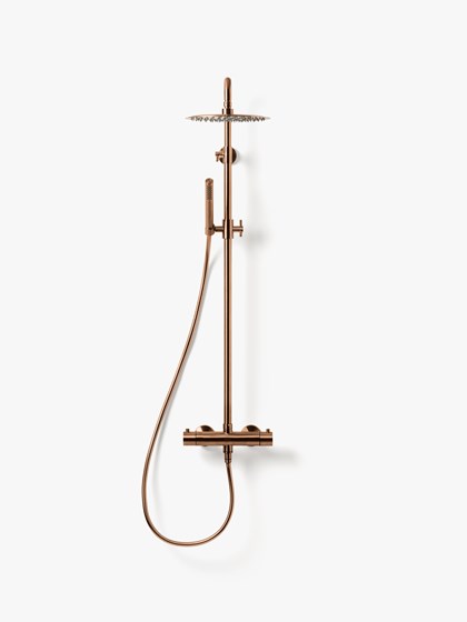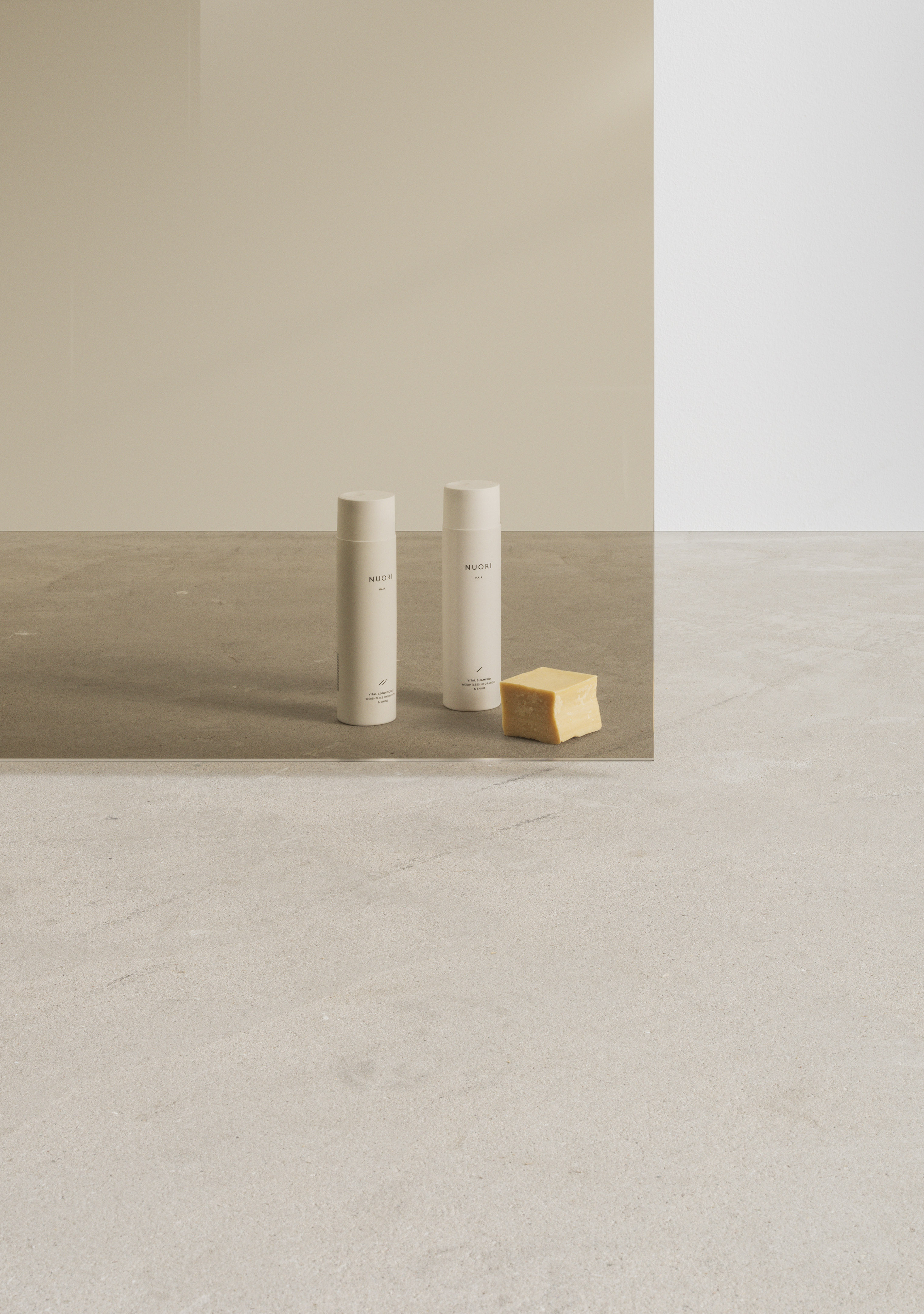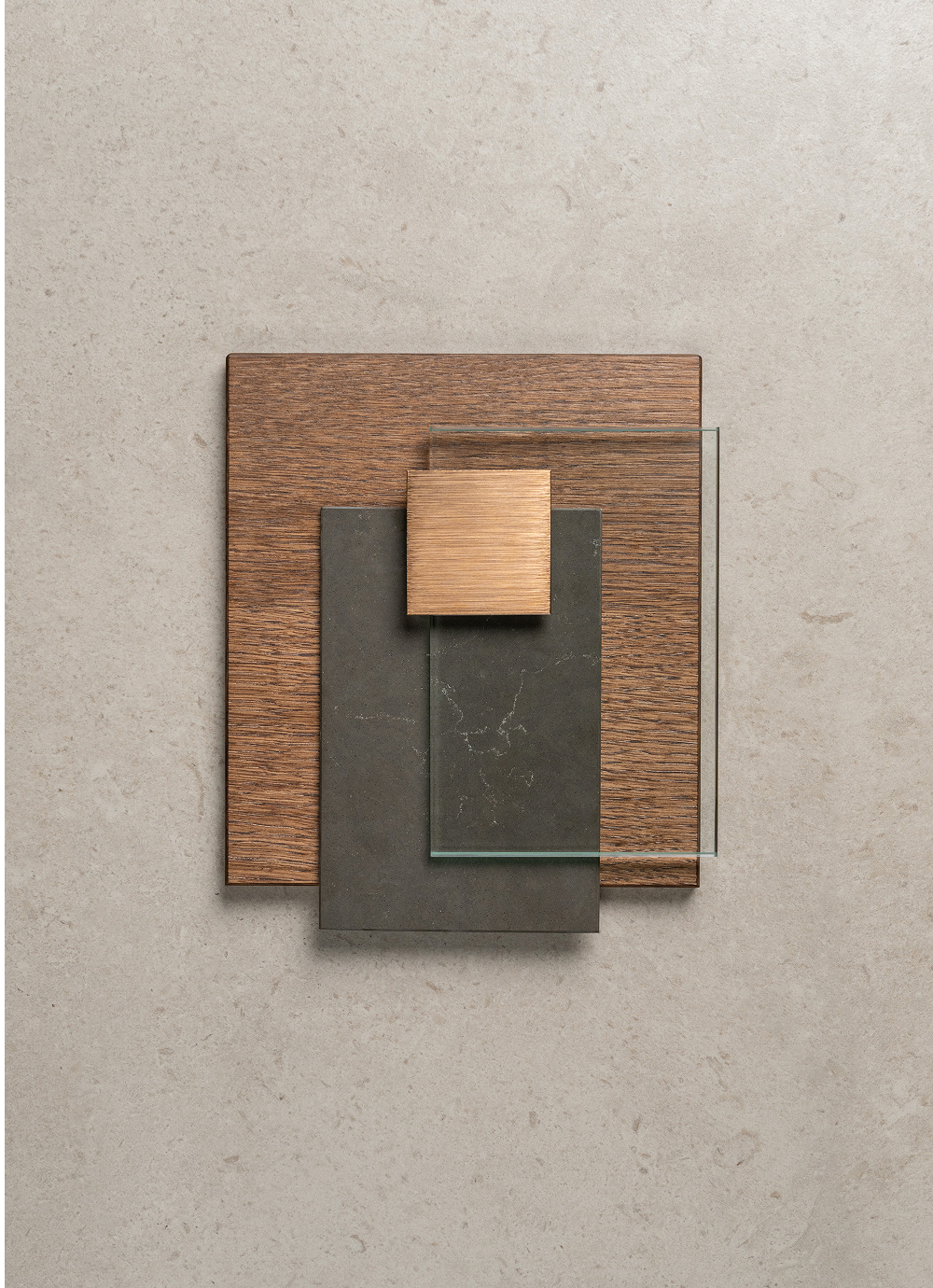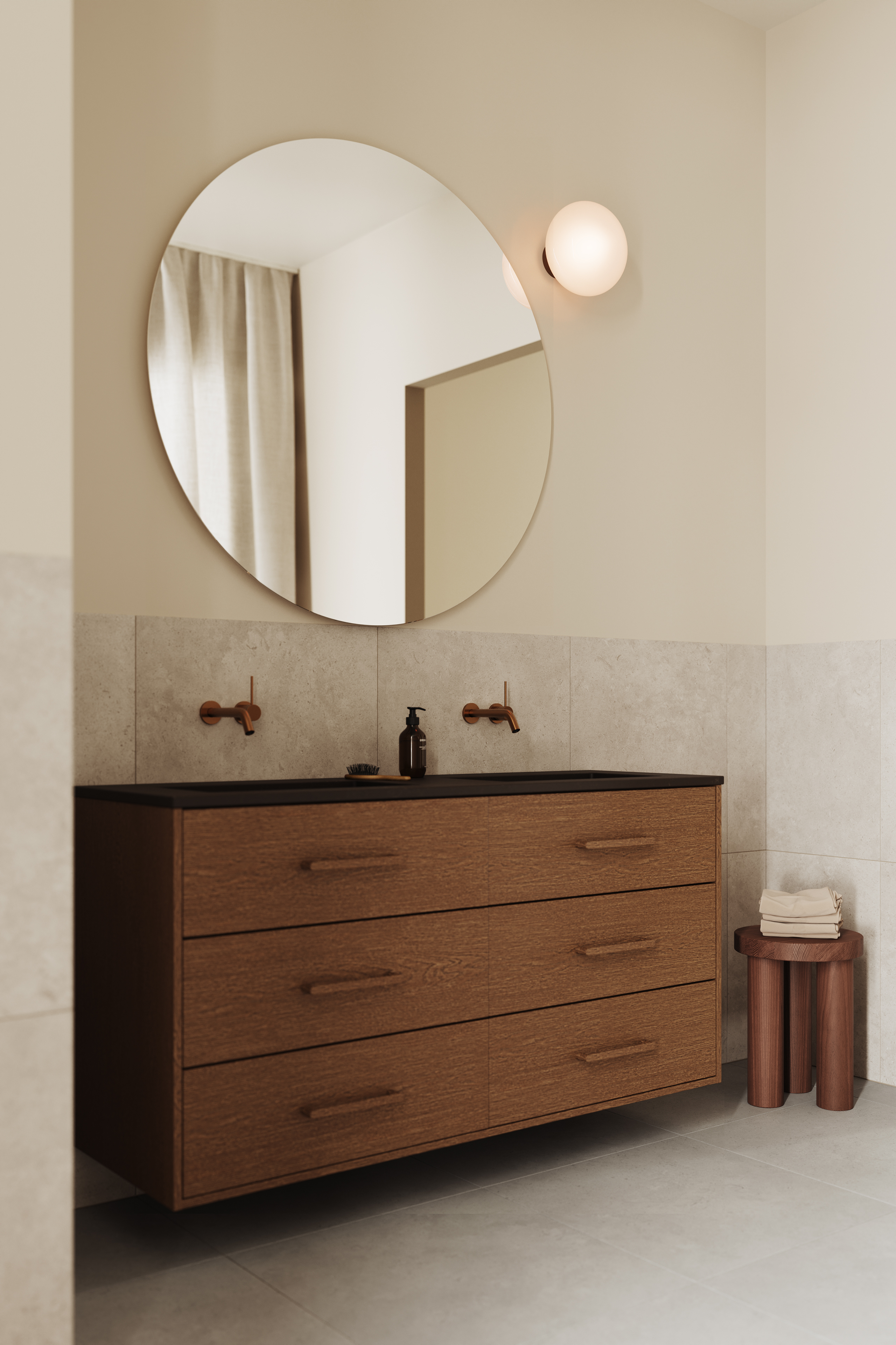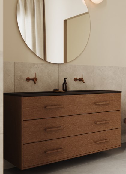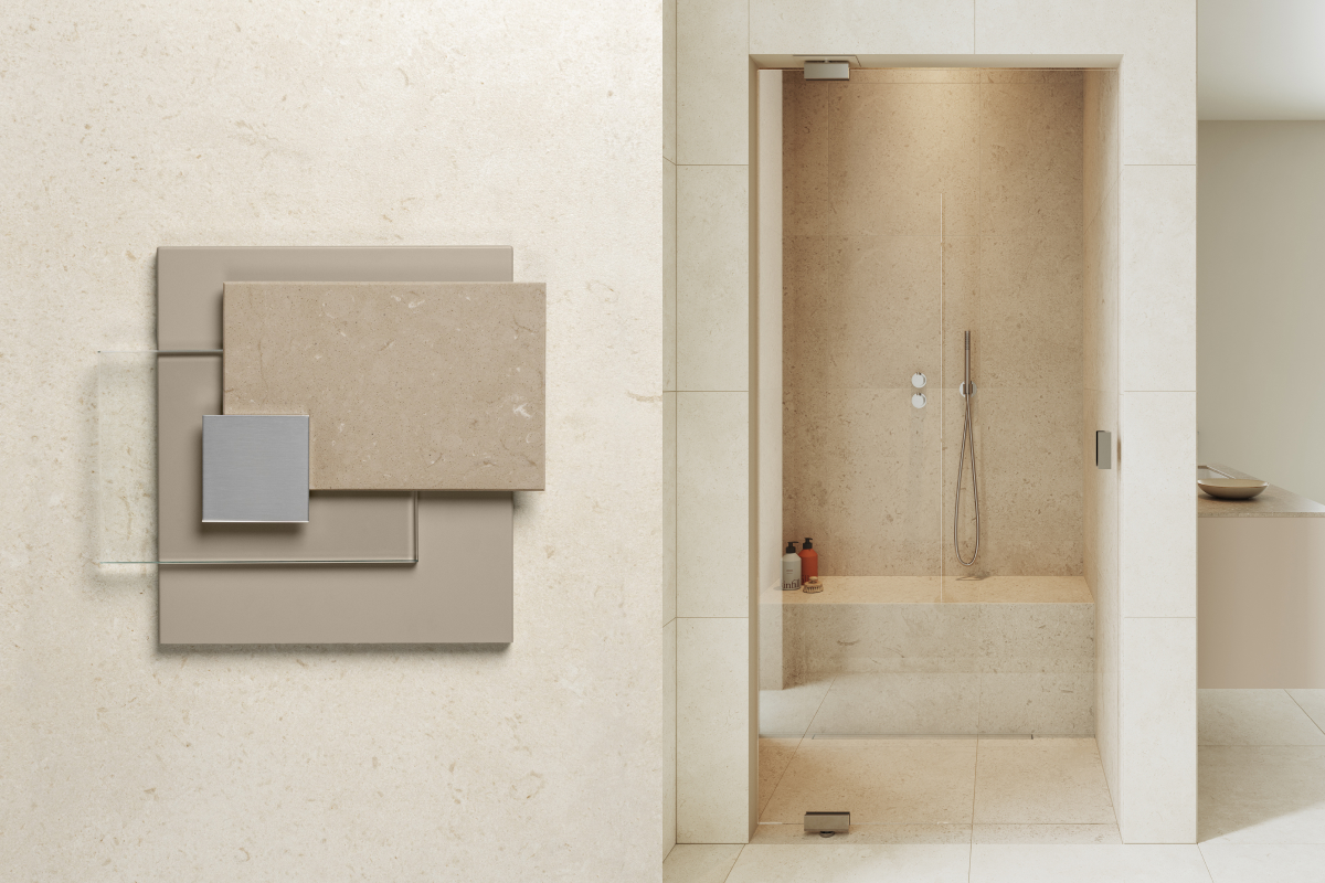 Hay bygger på kontrasten mellan ljust och mörkt – en palett där det skandinaviska uttrycket får tyngd och elegans. Granitkeramiken Stenvide Hay på väggarna paras med Stenvide Fog på golvet – ljusa tolkningar av gotländsk kalksten med stilla skiftningar som tillsammans skapar en lugn och luftig bas. Mot det ljusa träder inredningen fram i mörk ekfanér och varmt bronstonade metaller, som tillsammans tillför djup och karaktär. Hay är en palett för dig som vill skapa ett skandinaviskt badrum med varma träslag, balanserade kontraster och tidlös närvaro.