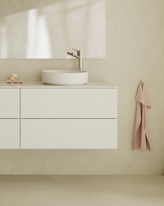 Avant kombinerar stilren design med funktionella detaljer, där de ovanpåliggande handtagen i samma kulör som möbeln skapar en enhetlig och elegant look. Välj din kommod i Pure White, Warm Clay eller Carbon Grey – alla ytbehandlade med TX Top Extreme™ – och anpassa vidare efter dina önskemål med ett av flera tvättställsvarianter alternativt bänkskiva med ovanpåliggande runt tvättställ. Om du värdesätter en smidig vardag kompletterar du möbeln med praktiska tillval såsom belysning i och under kommoden, småförvaring och dubbelt eluttag i nedre låda. Alla kommoder
