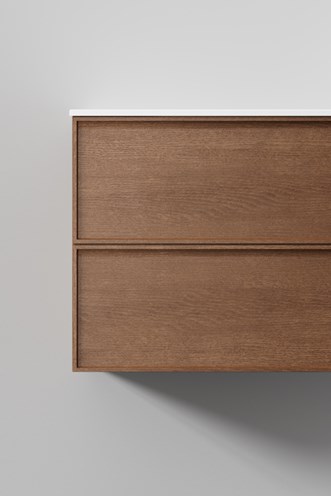 Solid kännetecknas av en slät front som ger ett tidlöst och minimalistiskt uttryck. Välj mellan flera olika tvättställ och färger, eller låt oss lackera din möbel i precis den nyans du önskar. Anpassa detaljerna efter din stil med en knopp, ett handtag eller push-open för en elegant och stilren känsla. Sensorstyrd belysning i och under kommoden, småförvaring och dubbla eluttag är praktiska tillval i vardagen. Alla kommoder
