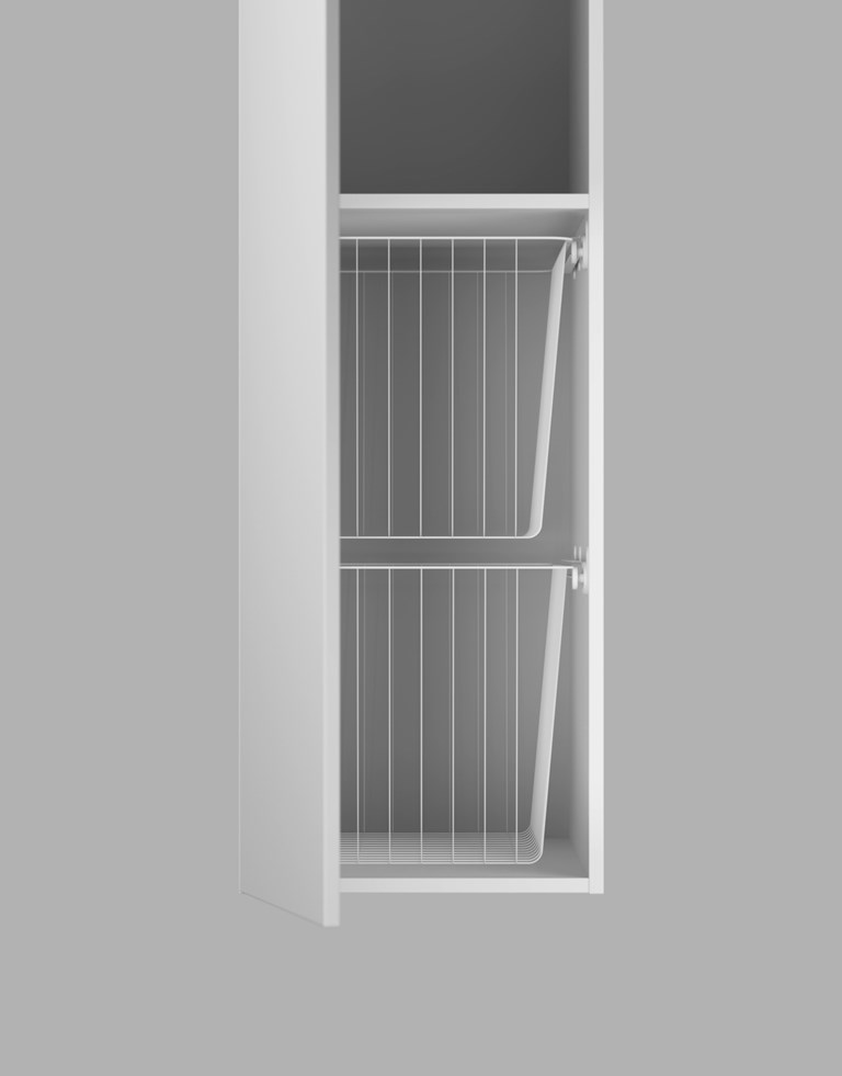 Stow är ett robust och funktionellt tvättskåp framtaget för att möta höga krav i moderna badrum. Skåpet erbjuder genomtänkt förvaring med två hyllplan, varav ett är flyttbart, samt två trådkorgar som gör det enkelt att sortera och organisera. Skåpet har en generös volym som rymmer det mesta du behöver i badrum, tvättstuga eller grovkök. Finns även i en bredare modell med lägre höjd. Handtag ingår inte utan köps separat, vilket ger frihet att anpassa både utseende och funktion. Flera olika öppningsalternativ gör det enkelt att matcha rummets övriga inredning.