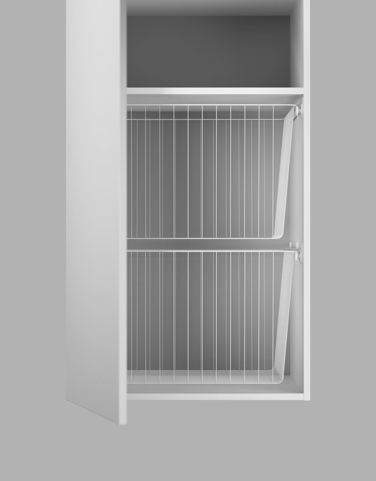 Väggskåp med grepplist för klädvård i tvättstuga, exakt färgmatchat med våra badrumsmöbler och med vitlackad stomme.