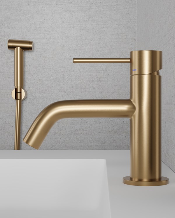 Låg tvättställsblandare med handdusch i rostfritt stål, perfekt för funktionell badrumsdesign. Den låga modellen erbjuder en elegant och diskret profil utan skarv som passar utmärkt för infällda och nedsänkta tvättställ. Bidéfunktionen gör det enkelt att sköta intim hygien och ger extra mångsidighet, exempelvis för att skölja föremål eller fylla en hink med vatten. Utrustad med avancerad teknik som sparar vatten utan att kompromissa på funktionalitet.