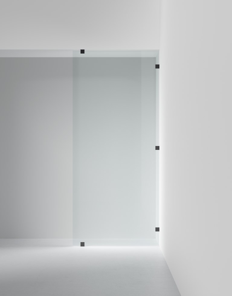 Skärmvägg i 8 mm glas, från golv till tak. Måttanpassas kostnadsfritt inom angivna intervall och från golv till tak upp till 2700 mm. Anpassas enkelt efter just dina mått.