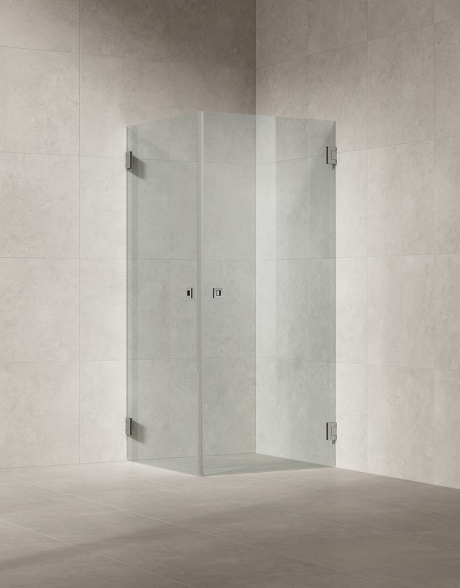 Duschhörna med två raka, invikningsbara dörrar i 6 mm glas. Finns i fasta standardmått som du kan kombinera fritt men också i måttanpassat utförande. Kombinera med Pile.