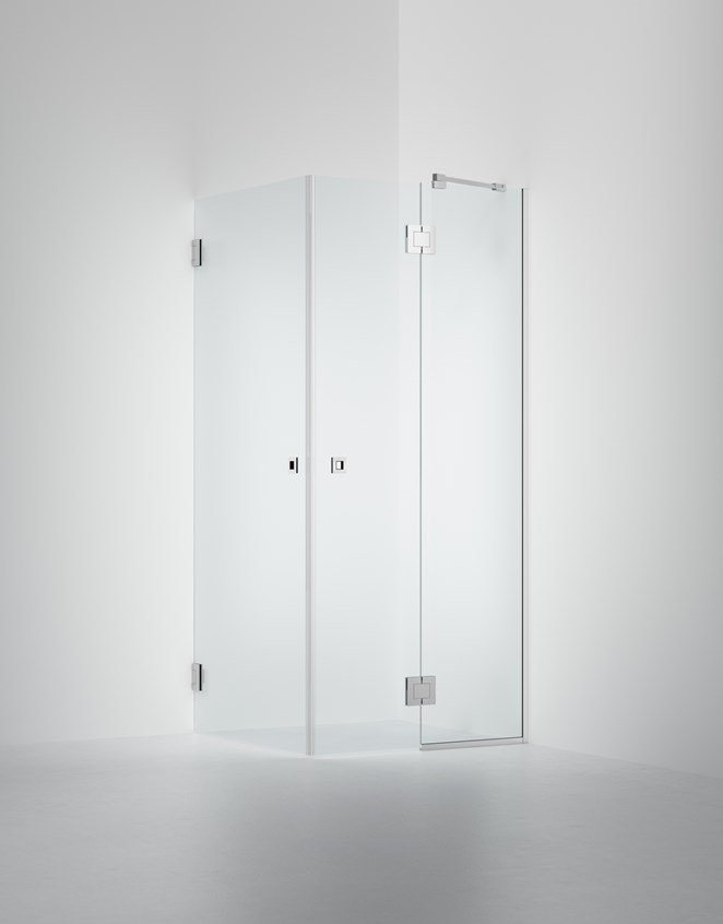 Duschhörna med två invikningsbara dörrar och en vägg i 6 mm glas. Måttanpassas inom angivna intervall. Kombinera med PILE.