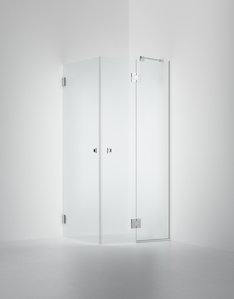 Duschhörna med en fast vägg och en dörr i 10 mm glas. Dörren upplevs nästan svävande när den roterar runt pivotpunkten i golvet. Måttanpassas inom angivna intervall.