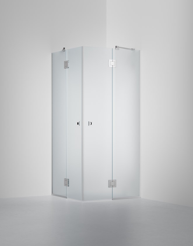Duschhörna med två invikningsbara dörrar och en vägg i 6 mm glas. Måttanpassas inom angivna intervall. Kombinera med PILE.