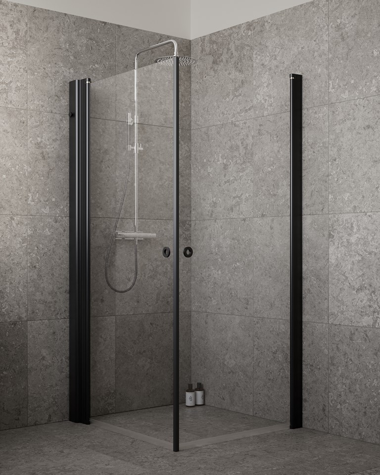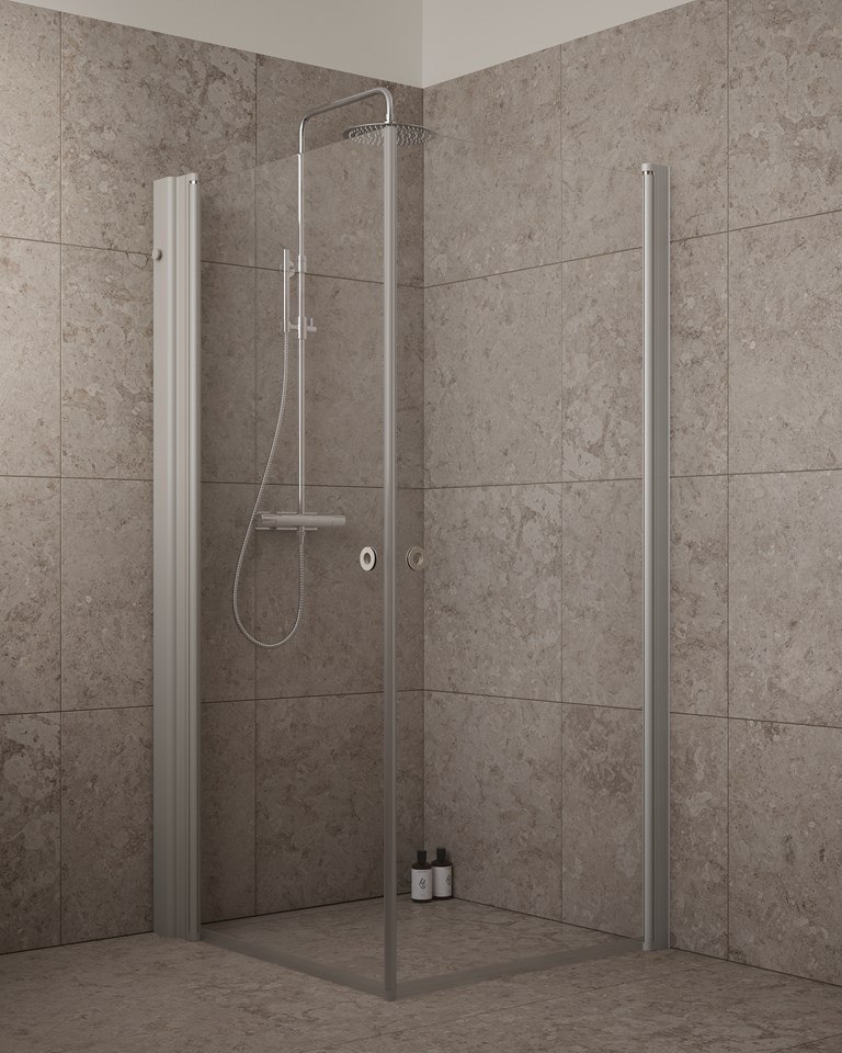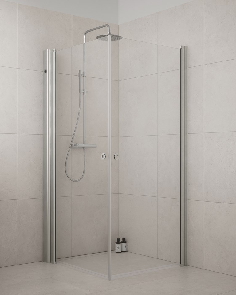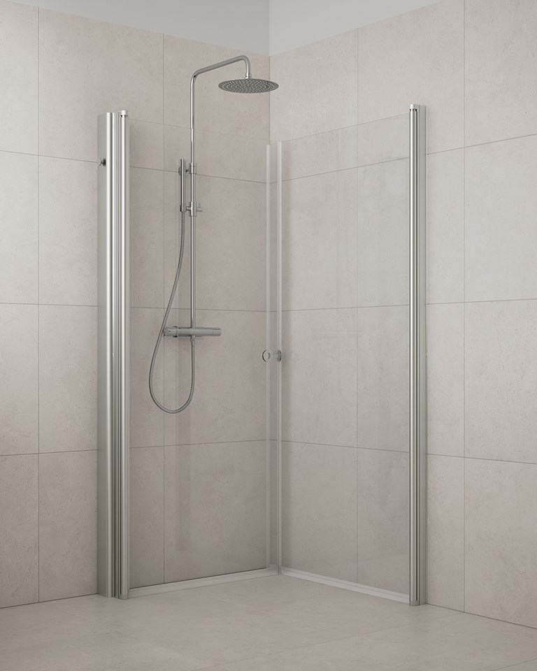 Duschhörna med två raka, invikningsbara dörrar i 6 mm glas. Finns i fasta standardmått som du kan kombinera fritt men också i måttanpassat utförande. Kombinera med Pile.