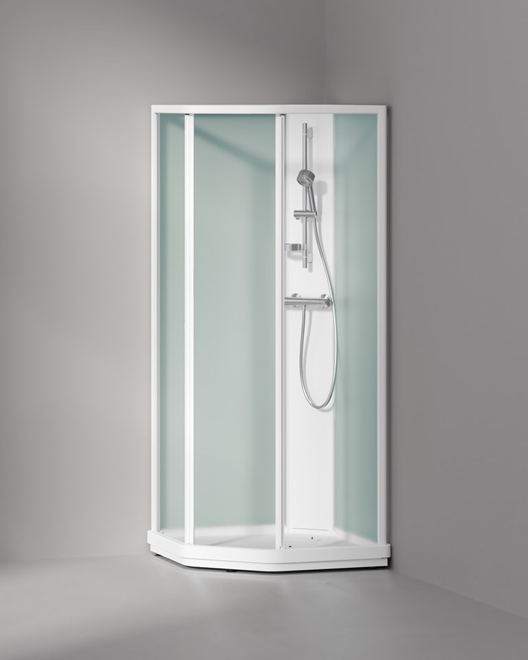 Duschkabin i 6 mm glas med skjutdörrar som kan anpassas i höjden 1800–2120 mm. Duschset från Mora ingår men termostatblandaren köper du själv.