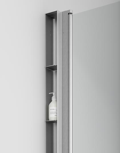 Väggskåp med fackindelad lucka för förvaring i duschen. Vippa ut den frostade luckan för att öppna och få en bra överblick över dina duschprodukter.