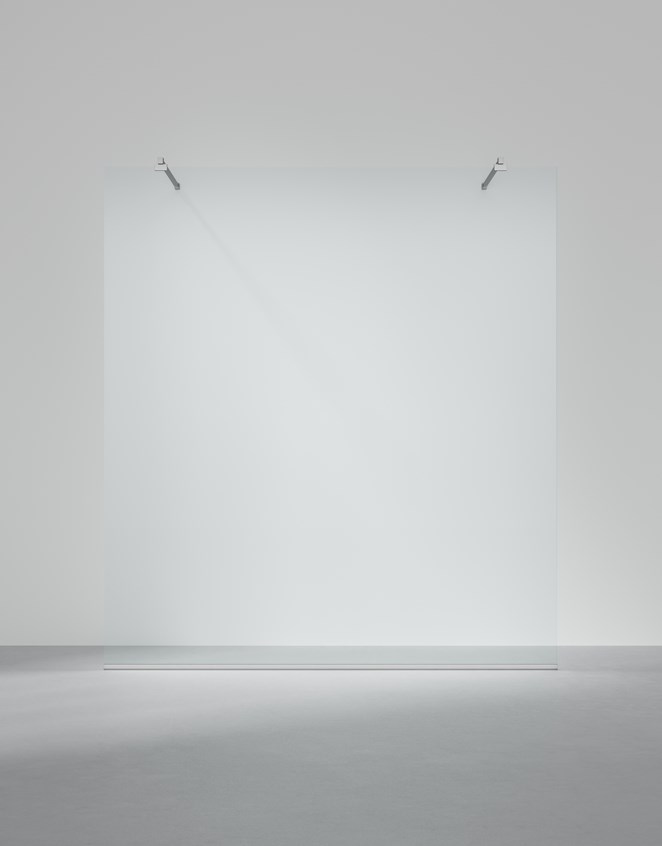 En fristående lösning i 8 mm glas för placering mitt på väggen. Måttanpassas inom angivna intervall. Anpassas enkelt efter just dina mått.