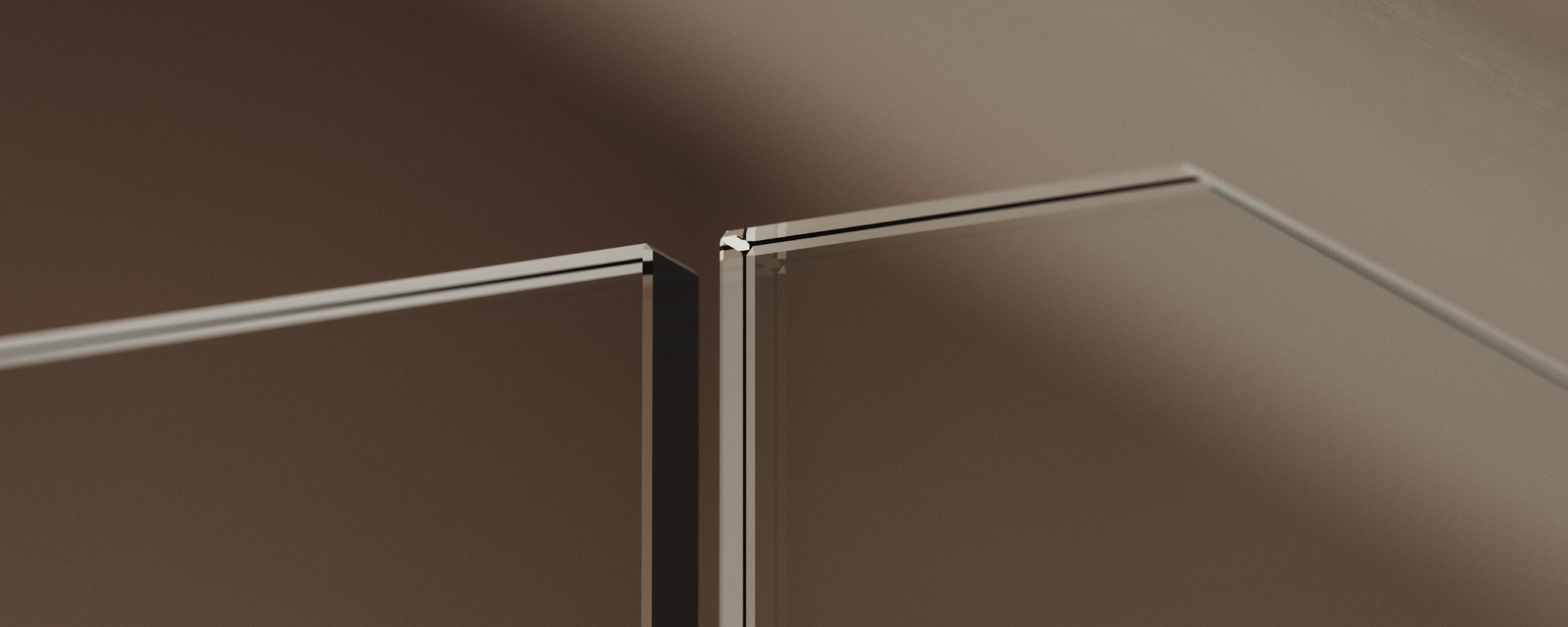 En fristående lösning i 8 mm glas för placering mitt på en vägg. Måttanpasas inom angivna intervall och från golv till tak, upp till 2700 mm. Anpassas enkelt efter just dina mått.