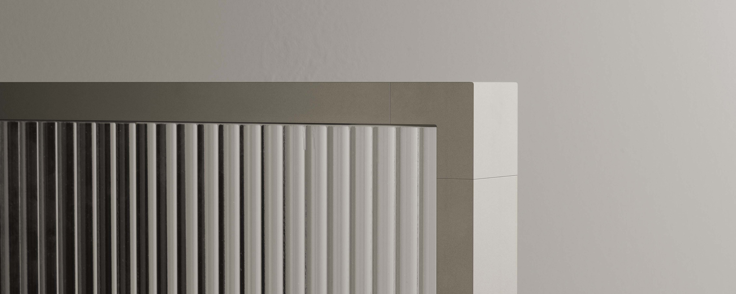 Edge tar plats i badrummet likt en vacker tavla, symmetriskt inramad i anodiserad aluminium i två finishar. Ramens unika konstruktion skapar ett sofistikerat skuggspel mot väggen. Glaset vetter inåt duschen vilket framhäver ramens utvändiga form och underlättar rengöring. Navet i Edge är gångjärnet med axel i rostfritt stål – ett utmärkt exempel på den perfektion i mekaniken som kännetecknar serien. Ramens hörnor är i massiv aluminium med en innovativ konstruktion som döljer allt som stör ögat. Modellerna med dörr lyfter elegant vid öppning och har dolda, utbytbara tätningslister infällda i ramen.