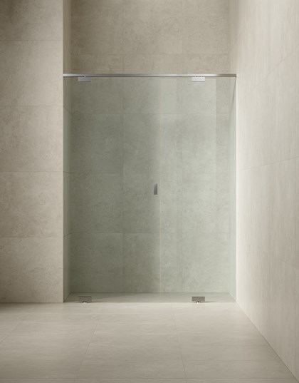 Duschlösning med pivotupphängt 10 mm glas som upplevs nästan svävande när den roterar runt pivotpunkten i golvet. Måttanpassas inom angivna intervall.