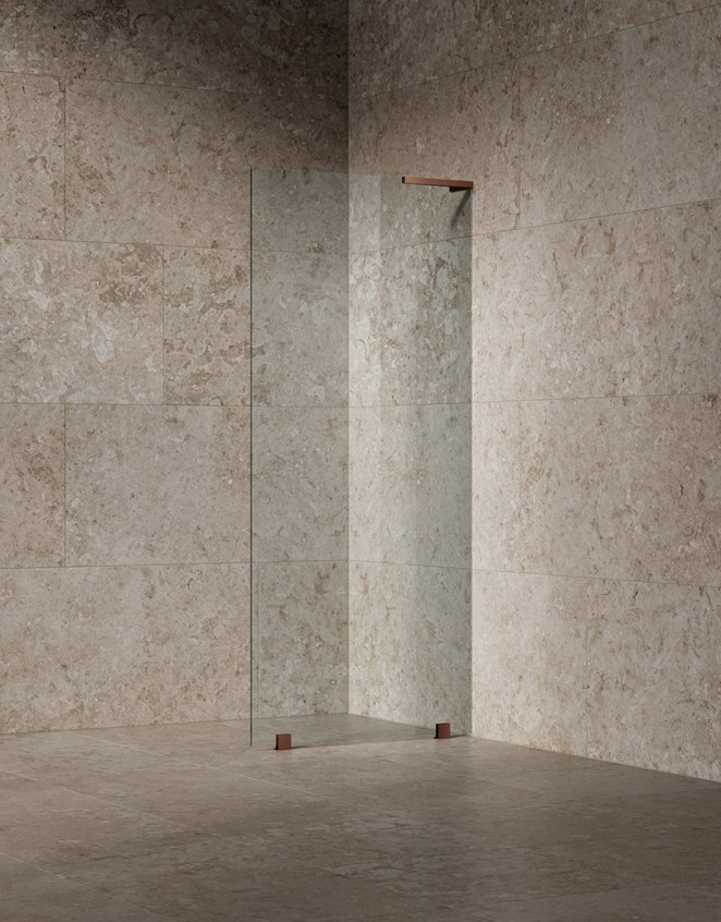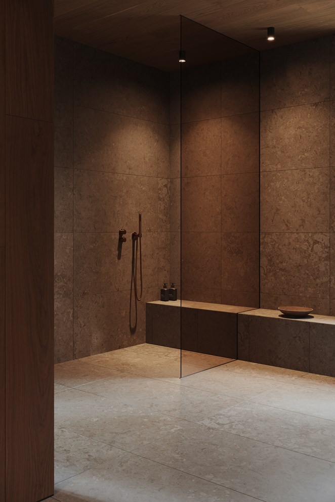 Klinker med livfullt öländskt kalkstensmönster i mustig varmbrun ton för ett badrum med karaktär.
