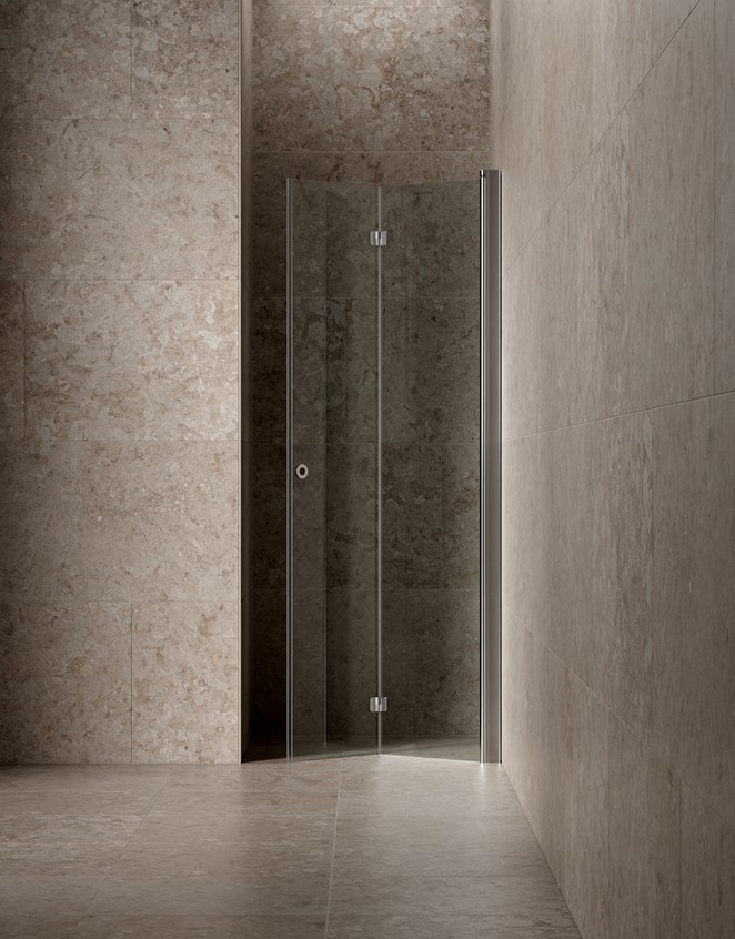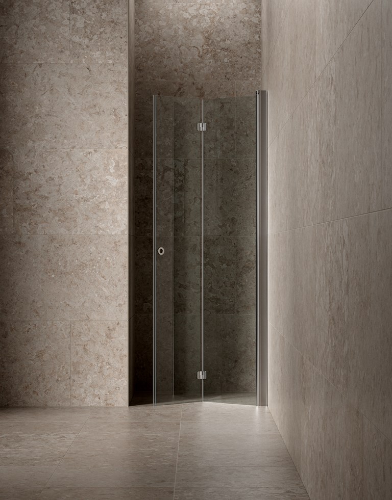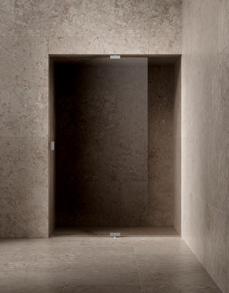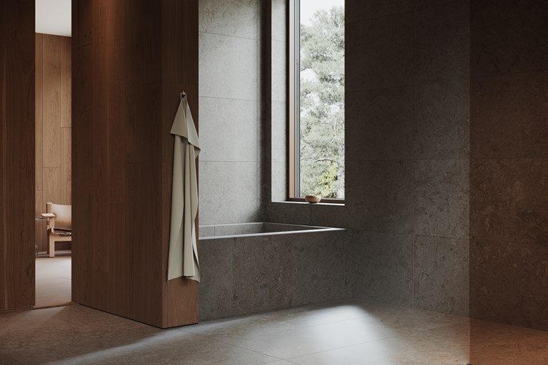 Klinker med stillsamt gotländskt kalkstensmönster i ljus beige nyanser för ett badrum i mjuk harmoni.