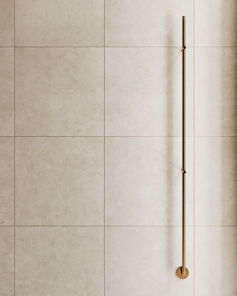 Klinker med stillsamt gotländskt kalkstensmönster i ljus beige nyanser för ett badrum i mjuk harmoni.