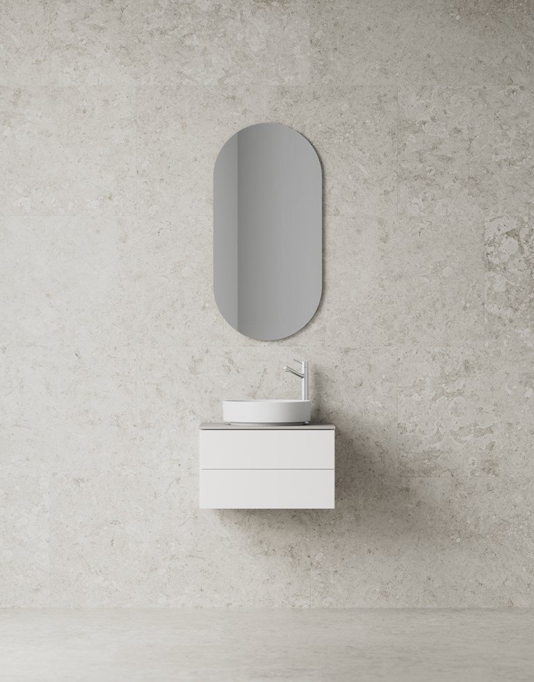 En rymlig kommod med infräst grepp. Helt tvättställ i porslin eller med bänkskiva. TX Top Extreme™.