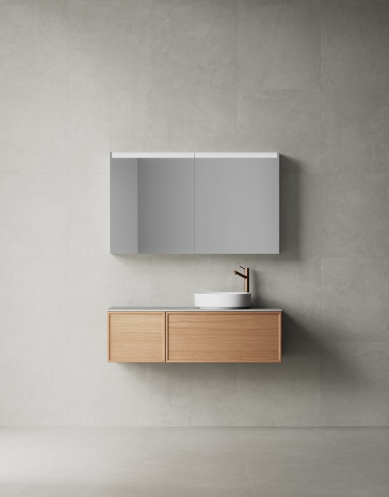 Air Wood är vår mest genomarbetade möbel och lika äkta som den ser ut. Sin starka identitet och äkta uttryck får den tack vare detaljerna i massiv ek och den fackindelade innerlådan som gömmer sig bakom den hela fronten. Det mattlackerade ekfanéret har obehandlad känsla där träets naturliga skiftningar gör möbeln än vackrare över tid. Välj mellan flera vackra, äkta ekfanér, alla med vår unika ytbehandling TX Top Extreme™. Till serien hör tre tunna, vackra och tåliga bänkskivor i kvartskomposit. Kombinera med runt tvättställ i matt vitt eller matt svart porslin.