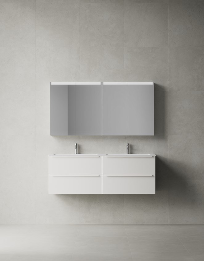 Kommodens rymliga design gör den till ett praktiskt och stilfullt val för större badrum som kräver bra förvaring. Dubbla tvättställ ger extra bekvämlighet i badrummet, och med valmöjligheter som tvättställ med dubbla hoar eller en bänkskiva med två separata runda tvättställ kan du skapa en lösning som passar din stil och dina behov. Båda är i solid surface, ett tåligt material med matt yta. Lådorna är designade för optimal förvaring och smidig användning, med soft-close och antiglidmattor, samt tillval som belysning och eluttag för extra komfort.