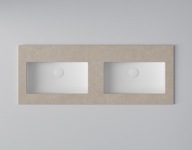Dubbla tvättställ i kommod med slät front och integrerad grepplist.
