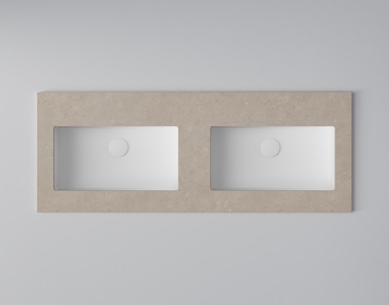 Dubbla tvättställ i rymlig kommod med rena linjer.