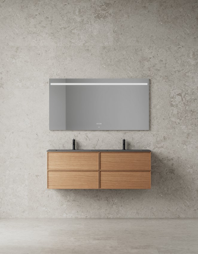 Kommod med slät front och elegant ram för ett lyxigt intryck. Det diskret dolda greppet i ramen gör öppningen enkel. Fanér ger en modern retrolook, eller välj din unika NCS-färg för personlig stil. Ytbehandlade med TX Top Extreme™ är våra badrumsmöbler skyddade mot fukt och slitage. Välj mellan tvättställ med dubbla hoar eller bänkskiva med tvättställ, i antingen porslin eller solid surface. Soft-close, antiglidmattor och tillval som sensorstyrd belysning och dubbelt eluttag ger både funktion och komfort.