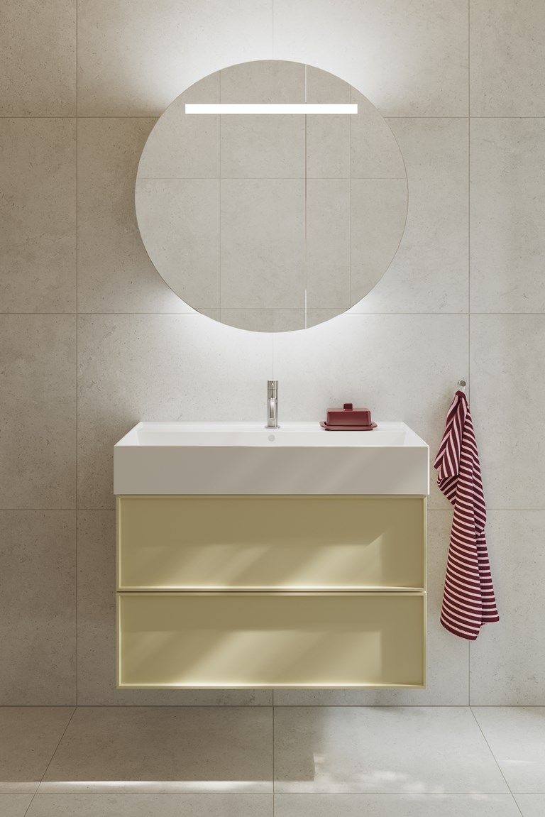 Stilren kommod med en slät front med ram för ett exklusivt intryck. Det diskreta dolda greppet i ramen erbjuder smidig öppning. Välj fanér för en modern retrokänsla eller din egen NCS-färg för personlig design. Anpassa med ett klassiskt porslinstvättställ, solid surface i matt utförande, eller bänkskiva kombinerad med tvättställ. Lådor med soft-close och antiglidmattor ger smidig användning, och TX Top Extreme™ skyddar och ger trygghet över tid. Komplettera med sensorstyrd belysning och dubbelt eluttag.