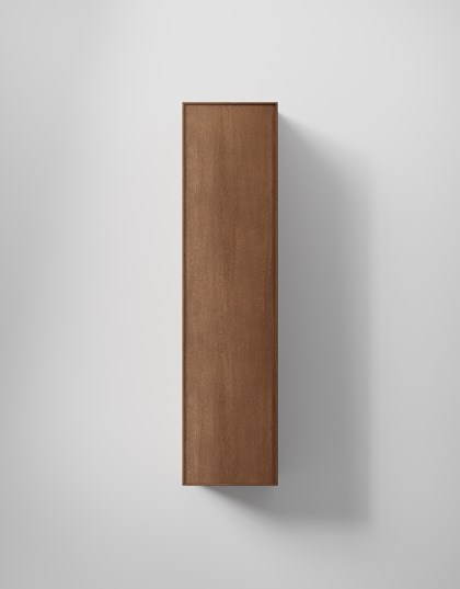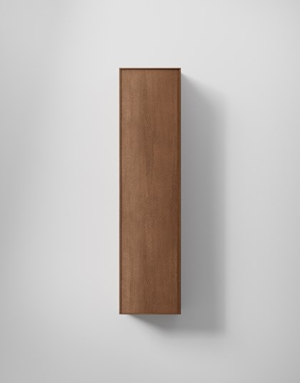 Svenskt högskåp med modern retrokänsla, perfekt för små badrum.