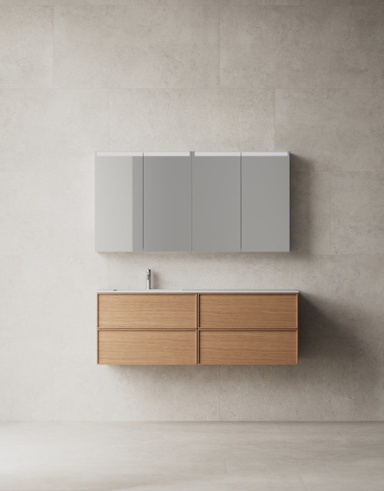 Rymligt och välutrustat spegelskåp med belysning, touchpanel, minnesfunktion och dubbelsidiga spegeldörrar.