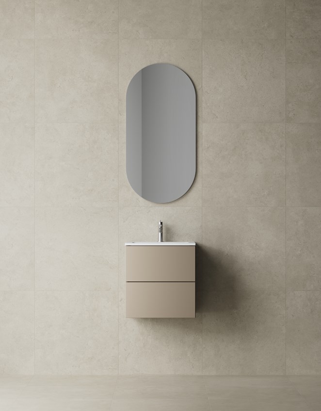 Oval spegel med stämningsbelysning bakom.