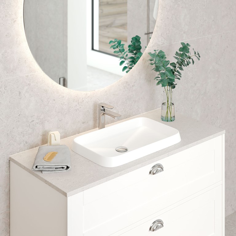 En rymlig kommod med infräst grepp. Helt tvättställ i porslin eller med bänkskiva. TX Top Extreme™.