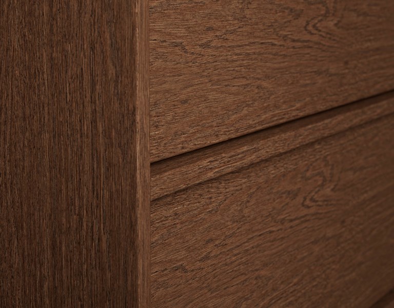 Terra Carve 120 D låter träet tala genom ett fanér i större mönster än i våra övriga serier, vilket skapar ett levande spel av nyanser och texturer. Det integrerade greppet förstärker känslan och gör att uttrycket blir både djärvt och harmoniskt på samma gång. Stomhöjden på 70 cm och de sex fullt utdragbara lådorna skapar plats för hela familjens badrumsvanor, snyggt organiserade och alltid nära till hands. Med två tvättställ blir möbeln en naturlig samlingspunkt, både praktisk och elegant. Välj mellan porslinstvättställ Shape och det ultramatta Smooth i solid surface. För ett mer personligt uttryck kan du kombinera bänkskiva i solid surface eller mineralkomposit med ovanpåliggande tvättstället Soak eller underlimmade Wave. Bänkskivan kan fås med (standard) eller utan hål för blandare, ett val du enkelt gör i Studio.