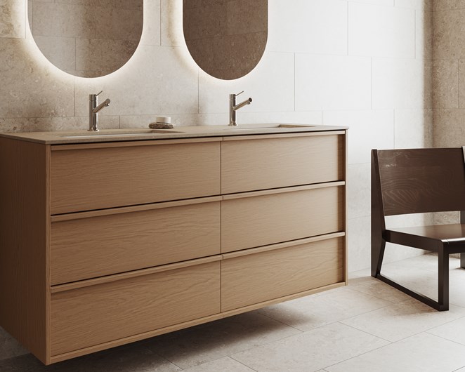 Med dubbla tvättställ och sex rymliga lådor erbjuder Terra Carve 140 D både generös förvaring och ett uttryck som drar blickarna till sig. Den karakteristiska fronten med integrerat grepp förstärker det skandinaviska formspråket och framhäver fanéret i Natural Oak eller Dark Oak. Med sitt större mönster än i våra övriga serier får träet ett levande djup som ger badrummet en varm och unik karaktär. Med en stomhöjd på 70 cm och sex fullt utdragbara lådor erbjuder Terra Carve 140 D en förvaring utöver det vanliga, perfekt för familjebadrummet där utrymme och ordning är A och O. De dubbla tvättställen gör möbeln till en naturlig samlingspunkt, lika praktisk som elegant.