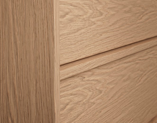 Generöst högskåp i fanér med två lådor och genomgående grepplist i massiv ek längs hela dörrens långsida. Adderar varm träkänsla, tydlig karaktär och maxad förvaring.